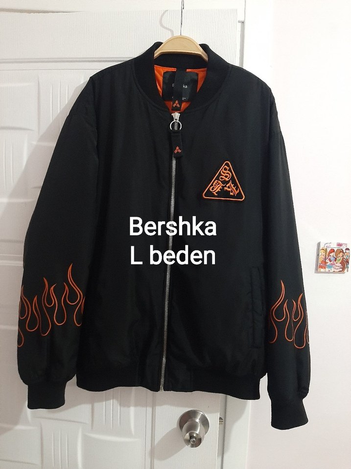 Bershka siyah mont, turuncu alev desenli uzun kollu ve fermuarlı. Rahat kesim, yuvarlak yaka ve yumuşak, sıcak kumaştan. Günlük sokak tarzı için uygun. sıfır ayarında