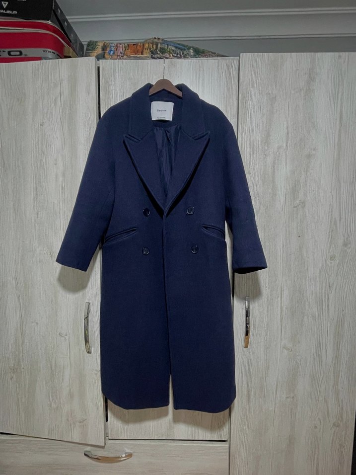 Lacivert renkli, çift düğmeli, yaka detaylı ve yan cepli uzun kaban. İç kısmı astarlıdır.