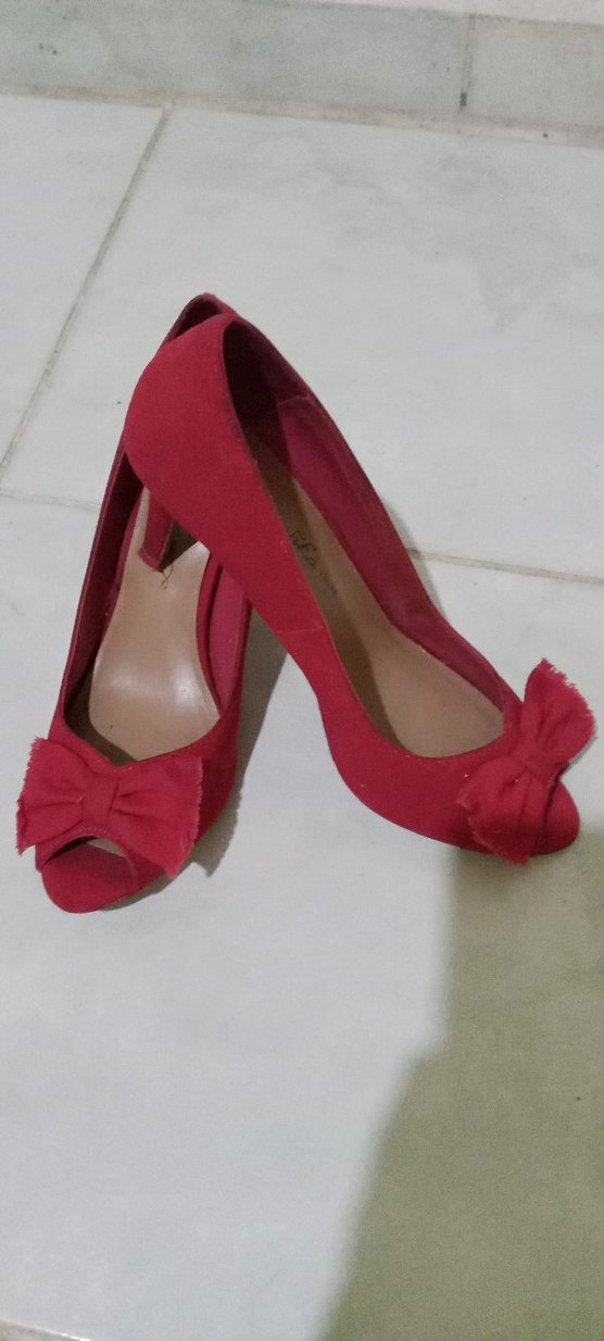 Bershka Marka Kırmızı keten malzemeden, yüksek topuklu, topuk yüksekliği 7 cm 'dir ve fiyonklu minimalist ve içi astarlı,Romantik akşamlar için uygun.