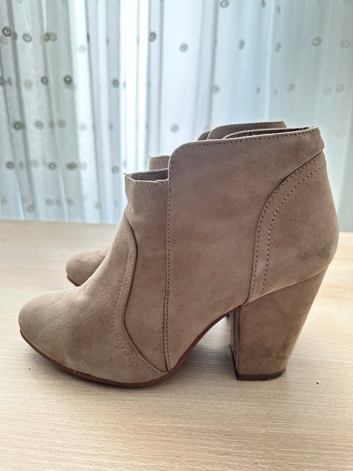 Bershka Marka, krem rengi süet, yandan fermuarlı, kalın topuklu rahat kovboy tarzı bot. 37 numara, topuk boyu 8 cm Bej süet malzemeden yapılmış, tokalı ve kalın topuklu kadın botu, rahat ve trend günlük kullanım için uygundur.