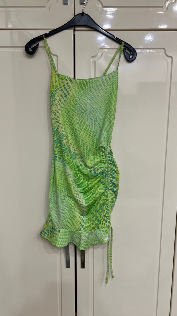 Yeşil, yılan desenli, parlak görünümlü, drapeli ve ince askılı midi boy, vücuda oturan elbise. Avant-garde stil ve partiler için uygundur.