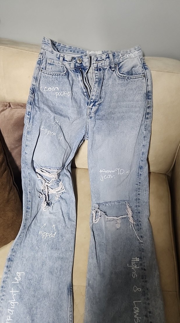 Baskılı detaylara ve yırtık bölümlere sahip mavi bol kesim denim jean. Kemer tokalı, midi boy ve günlük rahat sokak tarzı için uygundur.
