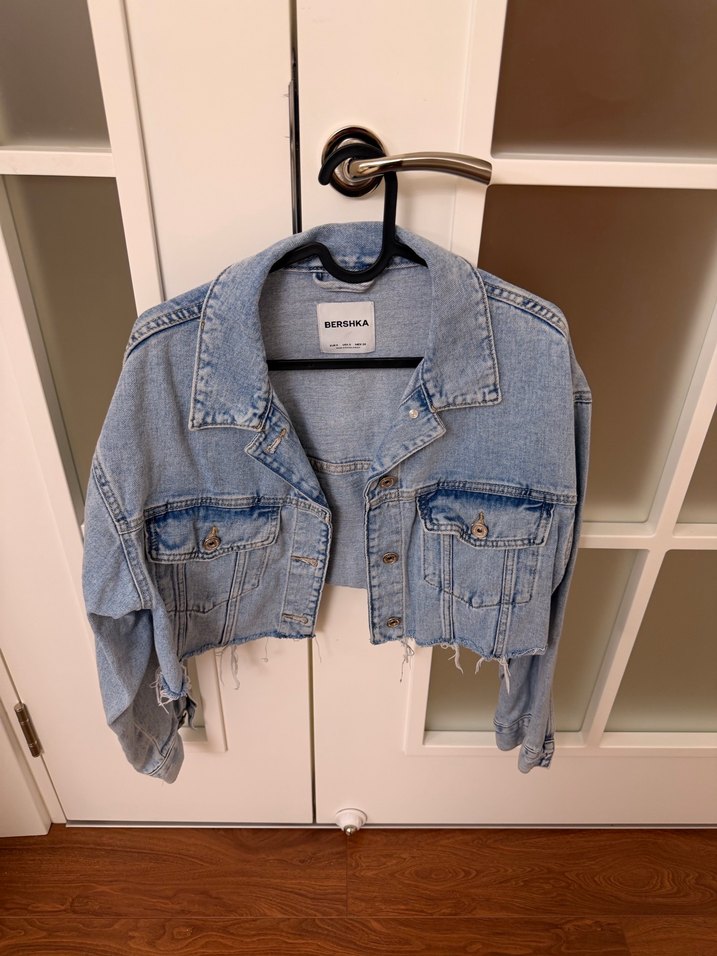 Mavi denim kumaştan üretilmiş, düğmeli ve oversize kesime sahip crop ceket. Uzun kollu, yakası notched lapel tarzında, iki göğüs cebi bulunur.