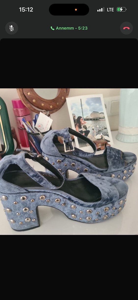 Mavi denim platform topuklu, tokalı ve metal zımbalı desenli ayakkabılar. Bohem ve punk sokak stilini yansıtır, günlük kullanıma uygundur. Az kullanıldı yıpranma hafif var