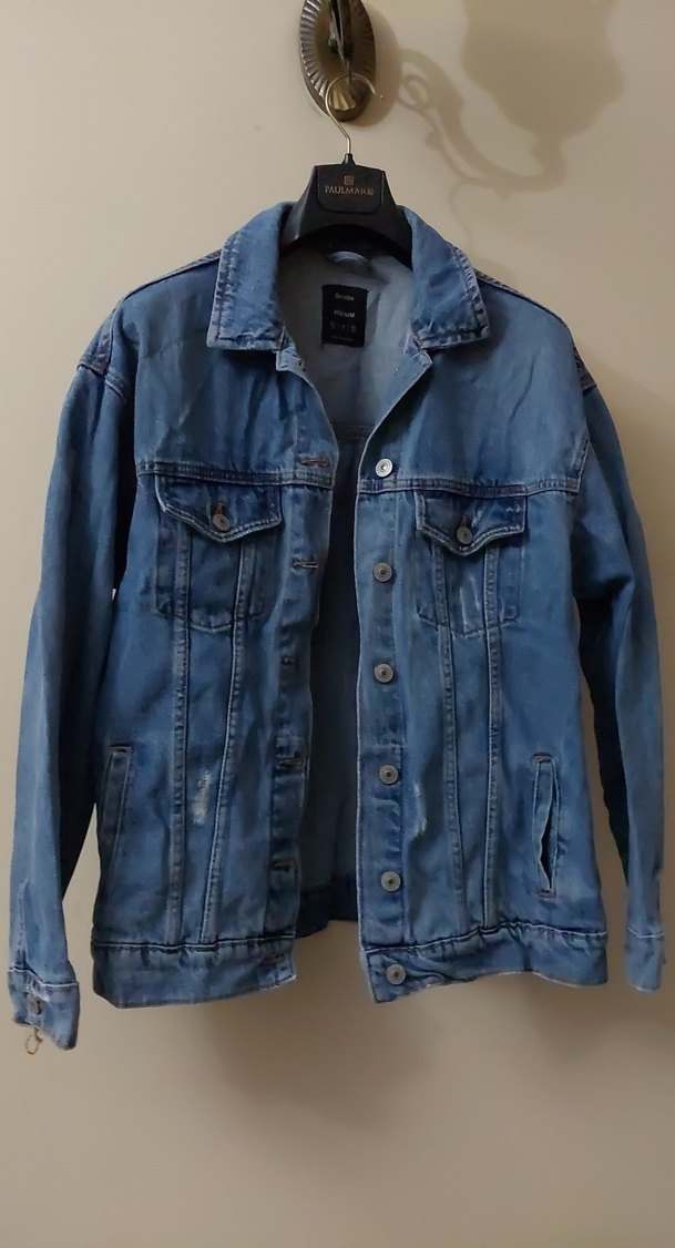 Cepleri geniş, iç cebi de var. Artık üstüme olmadığı için satıyorum. Düğmeli, uzun kollu, gri-mavi tonlarında, normal midi boyda, bol kesim kadın denim ceket. Notch yakalı ve günlük kullanıma uygun rahat bir tasarım.