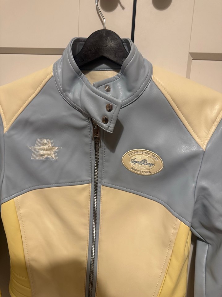 Açı sarı ve krem panellerle tasarlanmış, baskılı detaylı, yakalı ve fermuarlı, kadınlara özel deri biker ceket. Uzun kollu ve normal boyda, günlük kullanıma uygun.1 kere giyildi