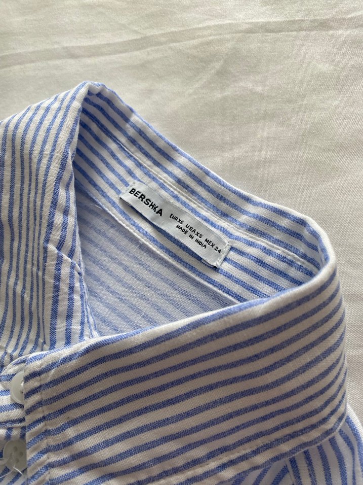 Bershka markalı, pamuk kumastan yapılmış, maviçizgili, gömlek yüzde 100 pamuk geçen yaz aldım 2 3 kere giydim sadece yepyeni yumuşak kumaştan bebe mavisi çizgileri önünden aldığımda farketmedıgom küçük bir defosu var