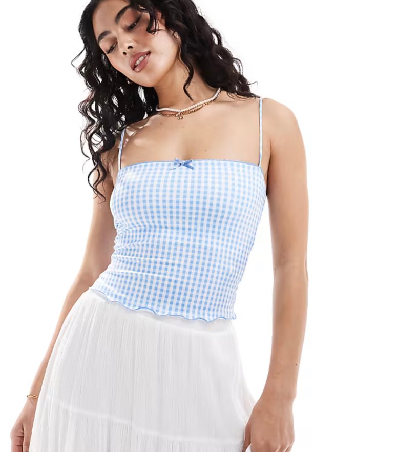 Mavi ekose desenli, ince askılı ve tekne yaka, pamuk kumaştan yapılmış, pileli dokulu, vücuda oturan bustiyer. Günlük kullanım için uygundur.