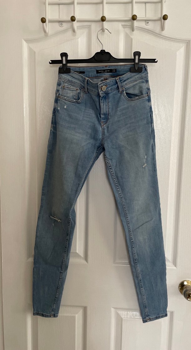 Bershka marka, mavi renk, açık tonlarda push up yani arka destekli orta bel jean. Vücudu çok güzel gösteriyor. Küçük geldiği için satıyorum.