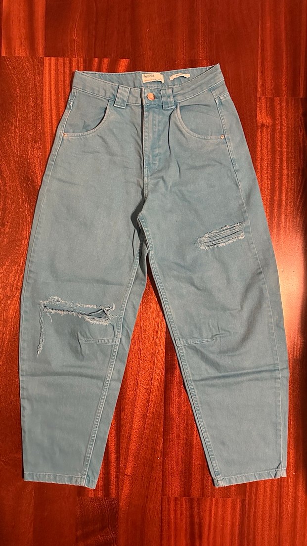 Balon kesim, orta bel, mavi denim kumaş, kadın jean. Ürünün rengi direk mavi-turkuaz yani renkli bir denim kumaşa sahip lütfen yanılmayınız‼️ İkinci fotoğrafta renk net şekilde gözükmektedir. Sol diz kapağının biraz üstünde ve sağ diz kapağında yırtık detayları bulunur.