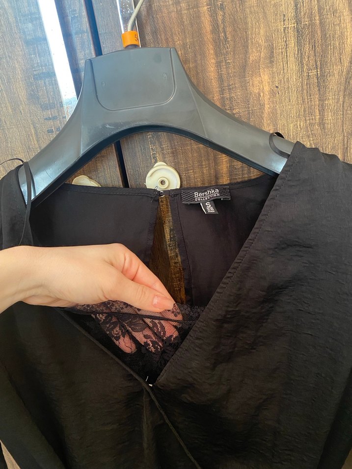 BERSHKA mini elbise içinde tamamen dantelden birleşik askılı bluzu var aşırı romantik bir elbise yanında hafif açılma var sona ekledim asla yırtık değil belli olmuyor xs bedene de uygun