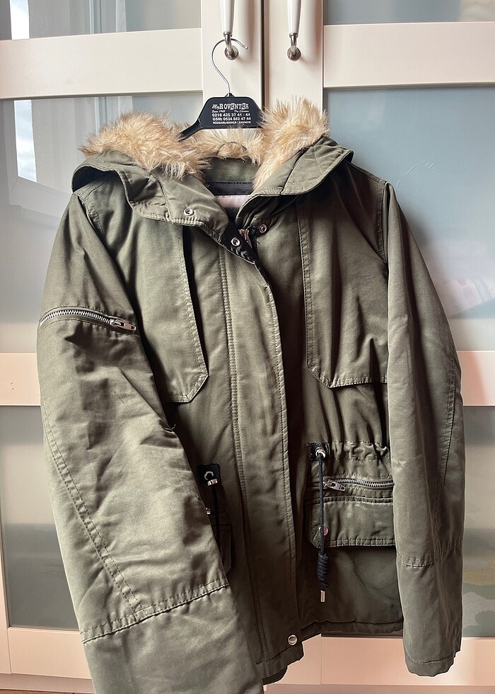 Ürün baya kalın ve çok sıcak tutuyo çok az giydim hiç bi hasarı yok o yüzden yeni gibi. Şapkası kürklü belinde ayarlanabilir ipi var.