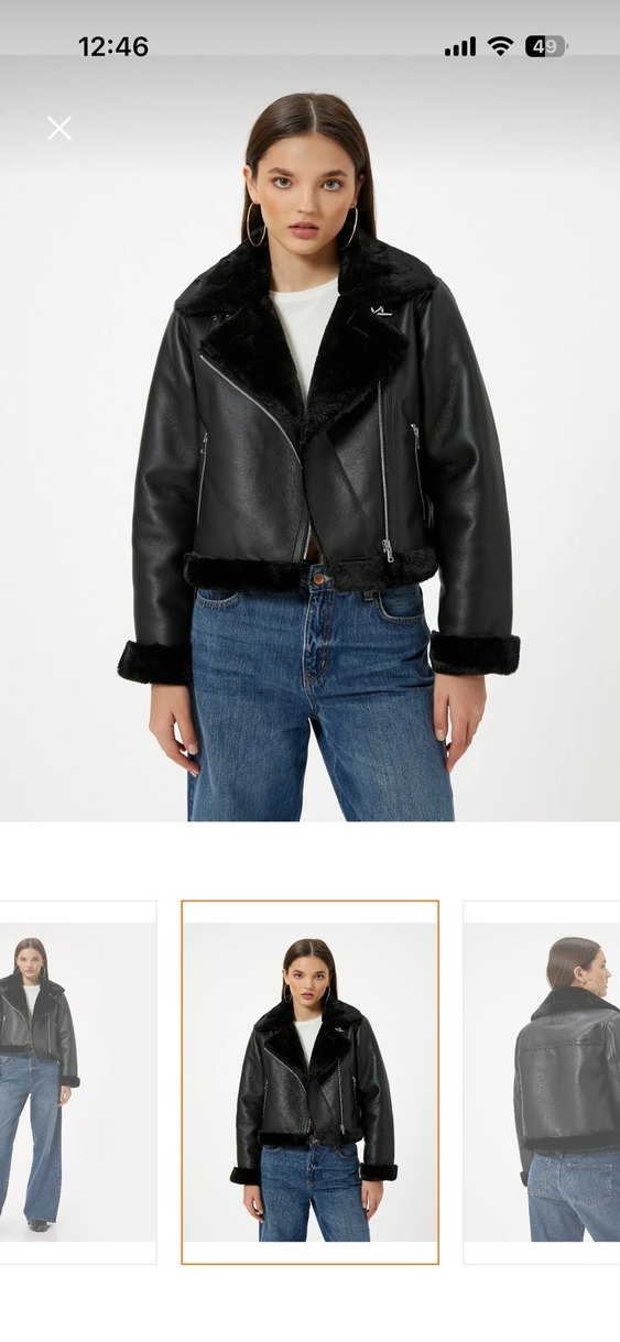 Kürk detaylı, siyah deri biker ceket, uzun kollu ve keskin yakalı, rahat ve şık bir görünüm sunar.