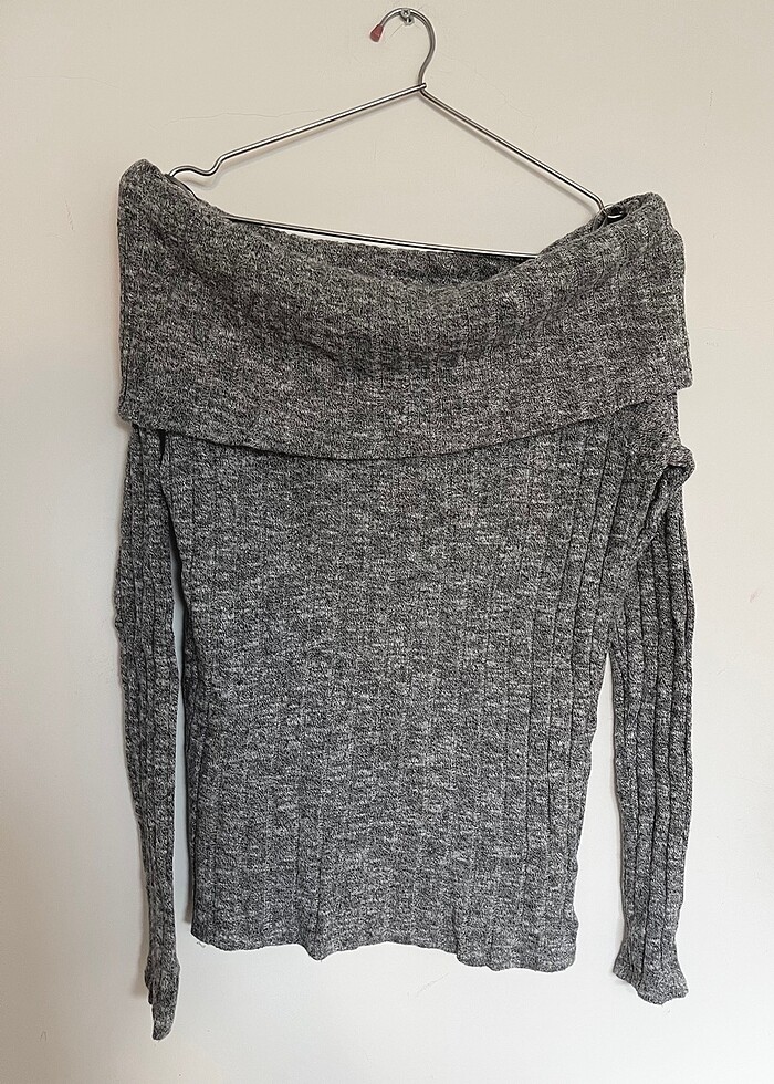Açık omuz yaka gri kırçıllı triko. Son fotoğraf ürünün yaka modelini gösteren temsili görseldir, ürüne ait değildir.