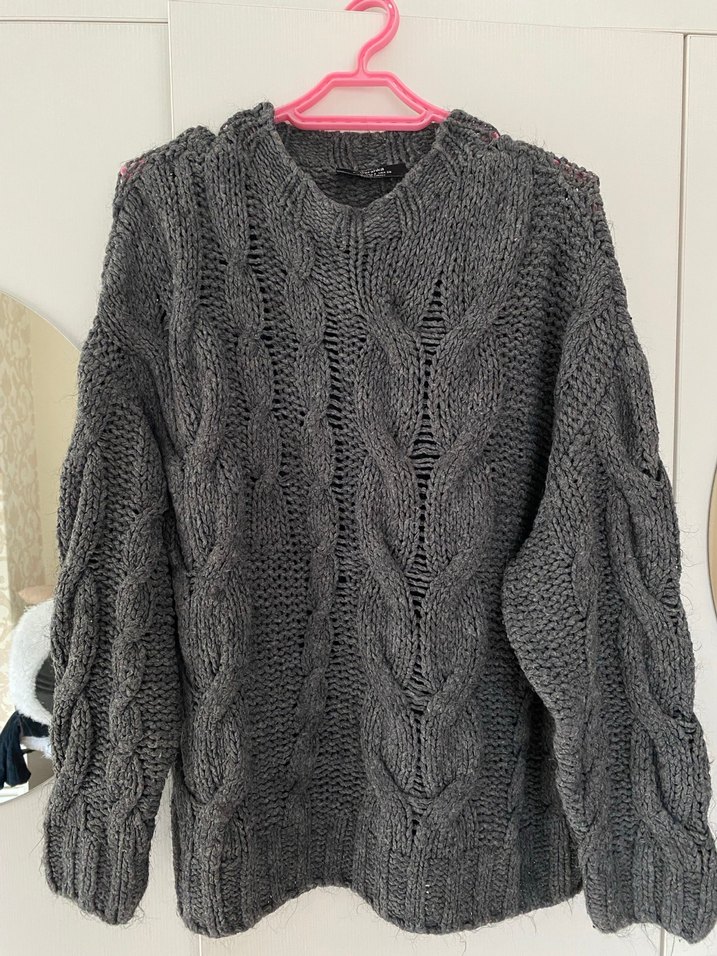 Gri antrasit örgü modelli düşük omuzlu kazak sorunsuz s beden mde tercih edebilir Son fiyat 300 olur