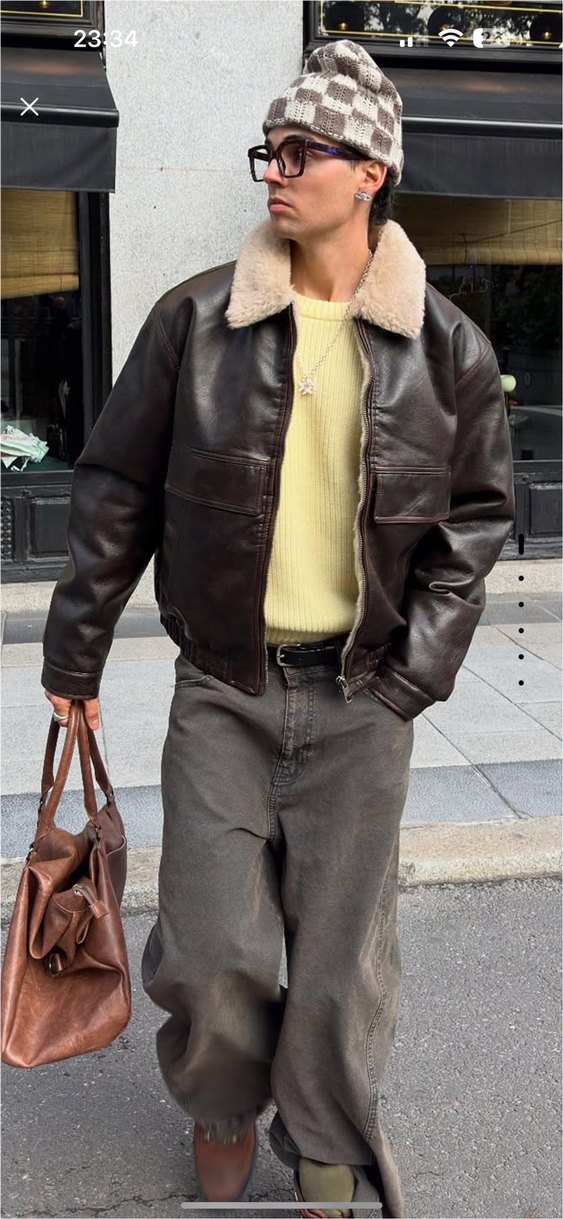 Bu erkek deri ceket, bol kesim ve yaka kısmında tokalı detay içerir. Uzun kollu ve kahverengi renkte, yumuşak açık renk yakaya sahiptir, günlük kullanıma uygundur.