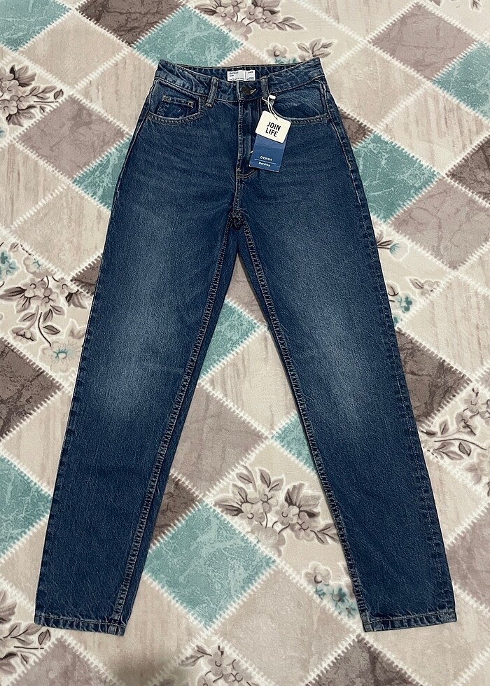 Hiç kullanılmadı, hiçbir problemi yok. Rengi denizci mavisi olarak geçiyor 32 beden mom jean