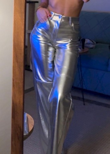 Parlak gri deri kumaştan, midi boyda ve vücuda oturan kadın pantolonu. Cesur sokak stili ve avangart parti kombinlerine uygun. ✨