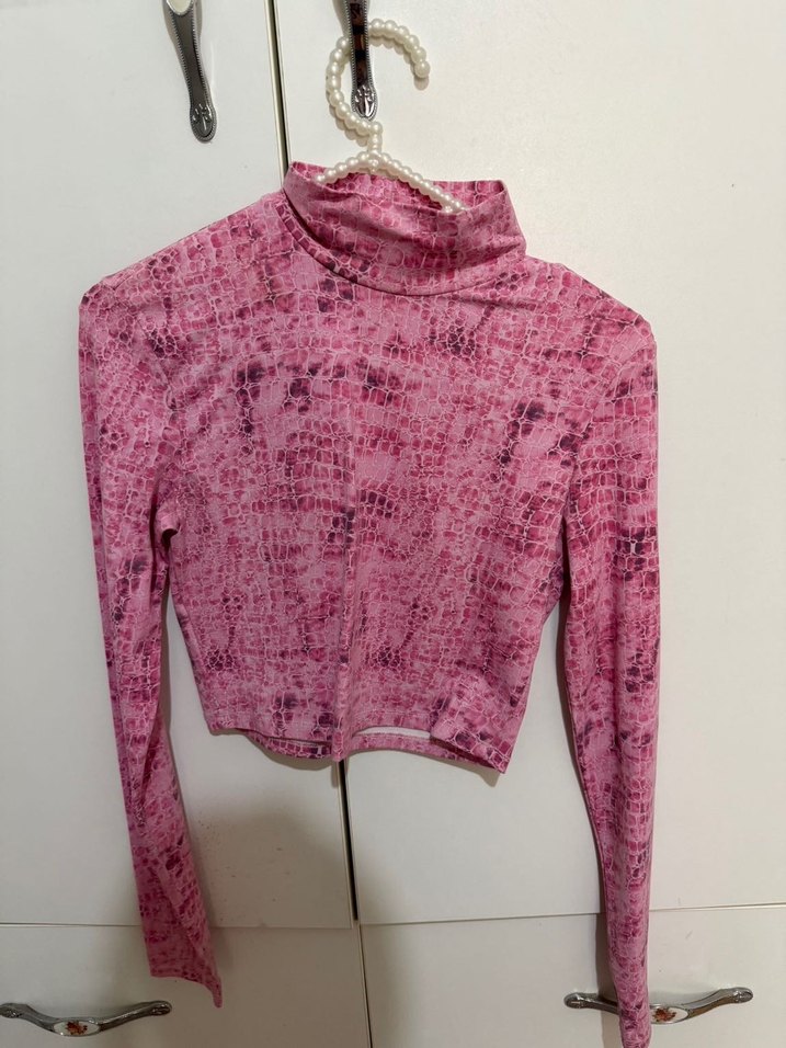 Pembe bağlama desenli, yarım balıkçı yaka, uzun kollu, kısa kesim kadın bluz. Sentetik kumaştan, örme dokulu, trend sokak stiline uygun.