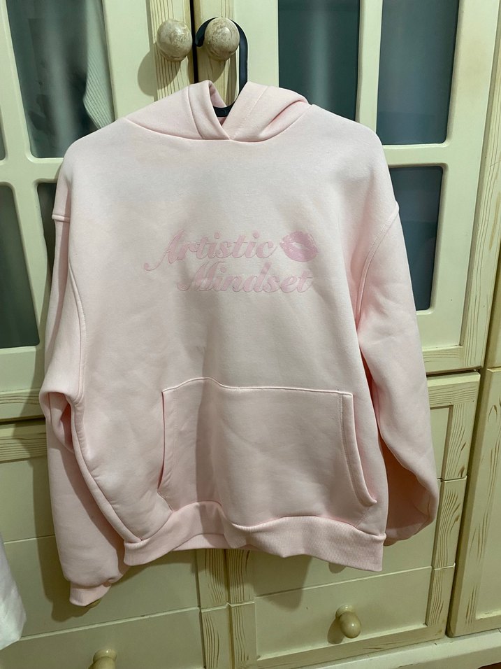 Pastel pembe kapüşonlu kadın sweatshirt, yumuşak örme kumaştan ve baskılı tasarımla. Uzun kollu ve bol kesim, oversizedir yeni aldım ancak iade süresi geçtiği için iade edemedim xs beden ama kalıbı oversize ibandan 800 olur