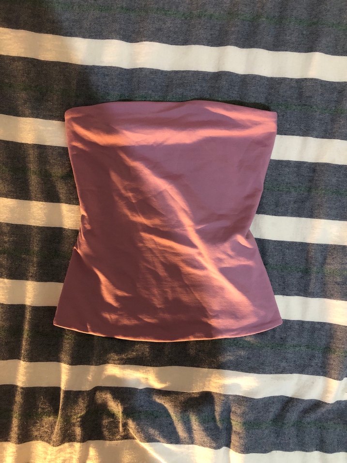 Pembe renkte, midi boy ve düz desensiz, vücuda oturan straplez bluz, şık bir görünüm sunar.