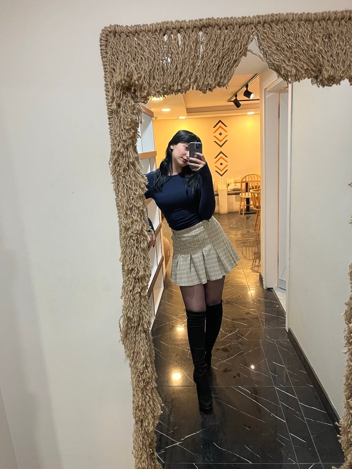 Deri malzemeden yapılmış, camel renkli, kareli desenli ve pilili tasarımlı, vücuda oturan mini etek. Günlük kullanıma uygun, trendi ve Paris tarzı normcore görünümlü.