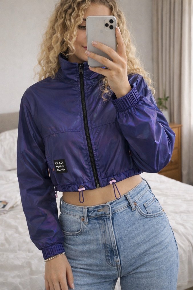 Bershka reflektör crop fit ceket. Mor–lacivert arası reflektör kumaşı ışığa göre renk değiştiriyor, fotoğraflarda net görünüyor. Crop kesim, bel lastikli ve ayarlanabilir ip detaylı. Uzun kollu ve midi boyda, vücuda oturan kesimi var. Üzerinde “Fresh Vibes” yazısı ve sol altta küçük “Crazy Young Fauna” etiketi bulunuyor. Hiç kullanılmadı, herhangi bir deformasyon, leke veya yıpranma yok; kondisyonu çok iyi. Günlük kullanımda ve spor kombinlerde rahatlıkla tercih edilebilir. Ev ortamında, doğal ışıkta çekilmiş gerçek fotoğraflardır. Sorusu olan olursa memnuniyetle cevaplarım.