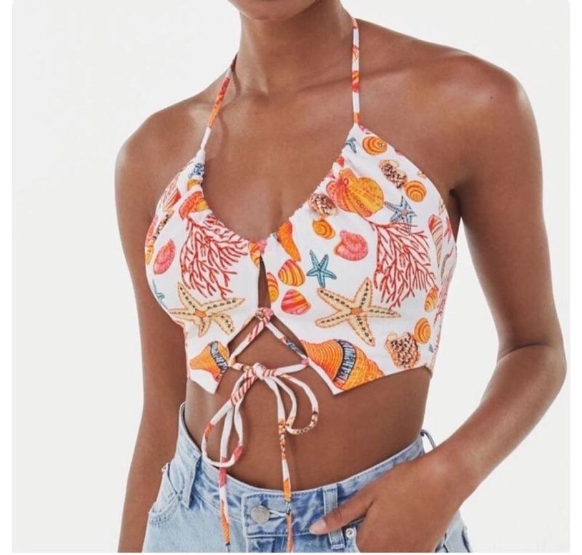 Bershka Renkli Deniz Kabuğu Desenli Boyundan Bağlamalı Crop Top