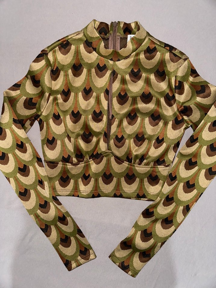 Uzun kollu, boğazlı ve fermuarlı bu kadın bluzu, kahverengi yılan desenli ve kısa kesimdir. Retro ve bohem tarzını yansıtır, sentetik kumaştan yapılmıştır.