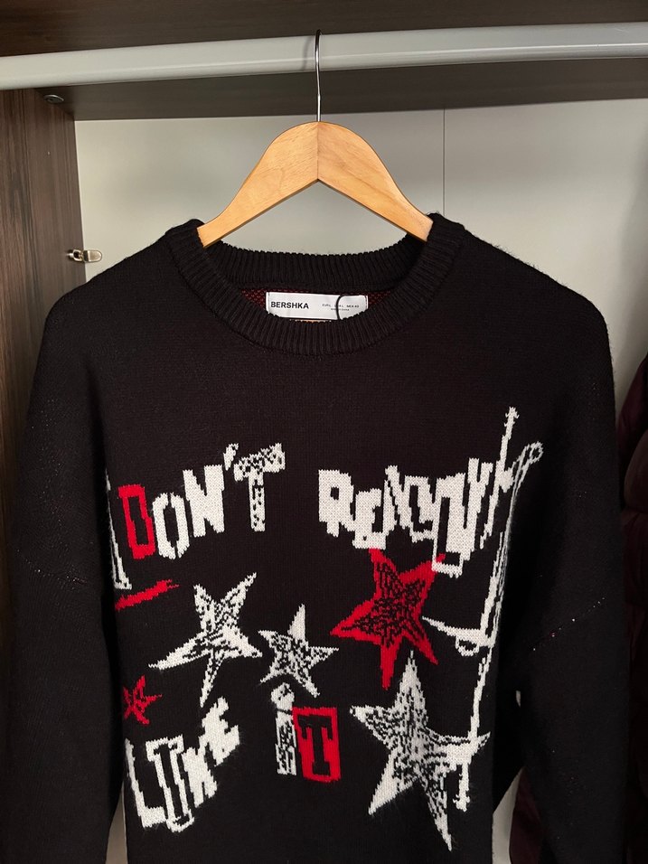 Siyah, örgü kumaştan, bol kesim, uzun kollu ve bisiklet yaka kazak. Desenli, rock punk tarzında yıldız ve yazı detayları içerir.