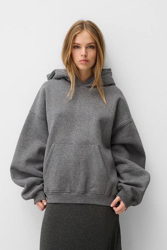 Salaş kesim, gri renkli, yuvarlak yakalı ve uzun kollu sweatshirt. Yumuşak ve sıcak kumaştan, rahat günlük kullanım için uygun.