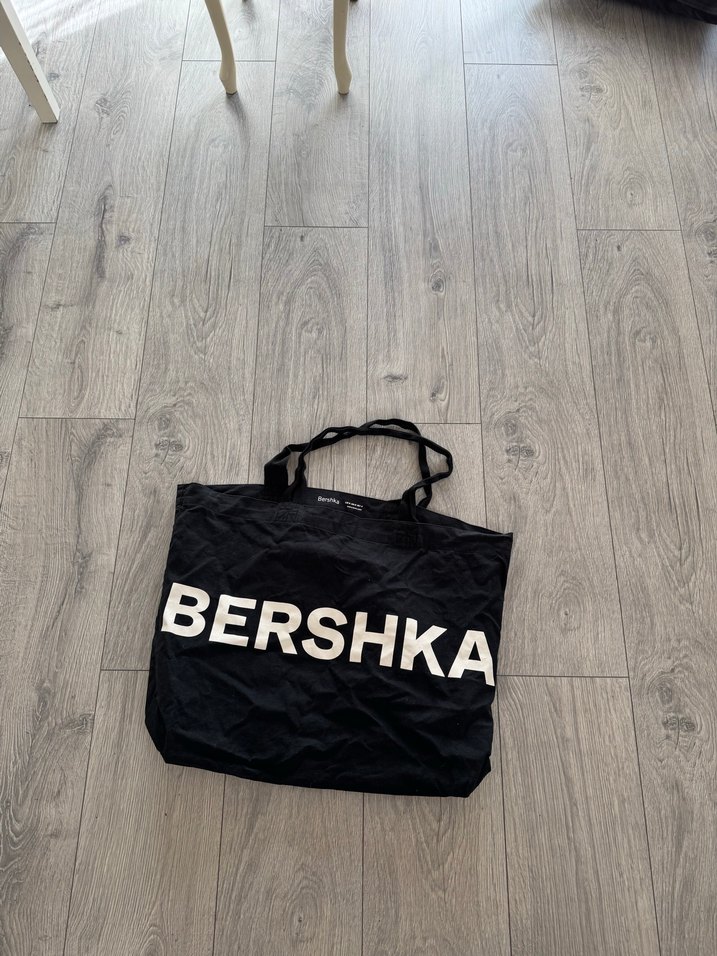 Siyah baskılı BERSHKA logosu ve tokalı detaylarıyla gündelik kullanım için uygun sentetik kumaş omuz çantası .