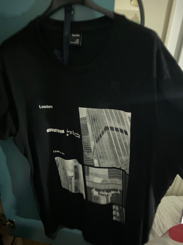 Siyah renkli, oversize kesim, kısa kollu ve bisiklet yaka erkek tişört. Üzerinde 'London' yazılı baskılı şehir temalı desenler bulunur. Günlük kullanım için uygun, yumuşak sentetik kumaş.