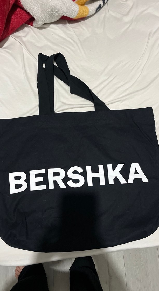 Siyah baskılı BERSHKA logosu ve tokalı tasarımıyla, sokak stili ve günlük kullanım için uygun sentetik kumaştan yapılmış kadın çantası.