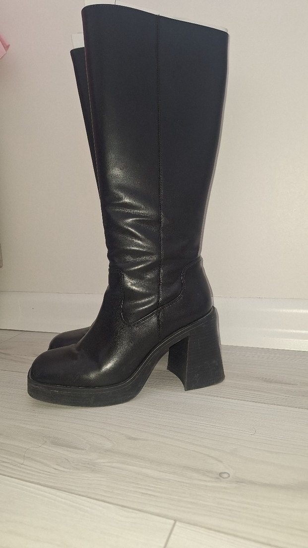 Siyah deri diz boyu botlar, kalın topuklu tarzda günlük kullanıma uygun. Bershka blok topuk çizme. Az kullanıldı defosu bulunmamakta Hızlı ve temiz gönderim sağlanacaktır.