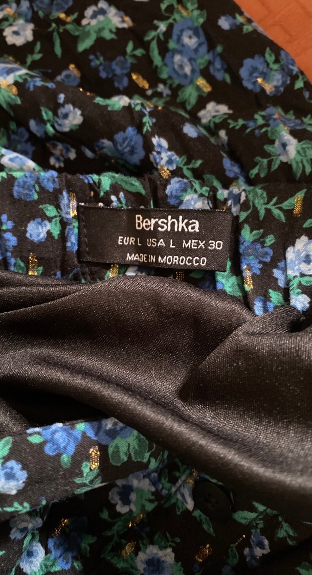 Bershka markalı, düğmeli detaylı, siyah çiçek desenli midi kumaş etek. Rahat ve hafif sentetik kumaştan, bohem tarzda uyumlu.
