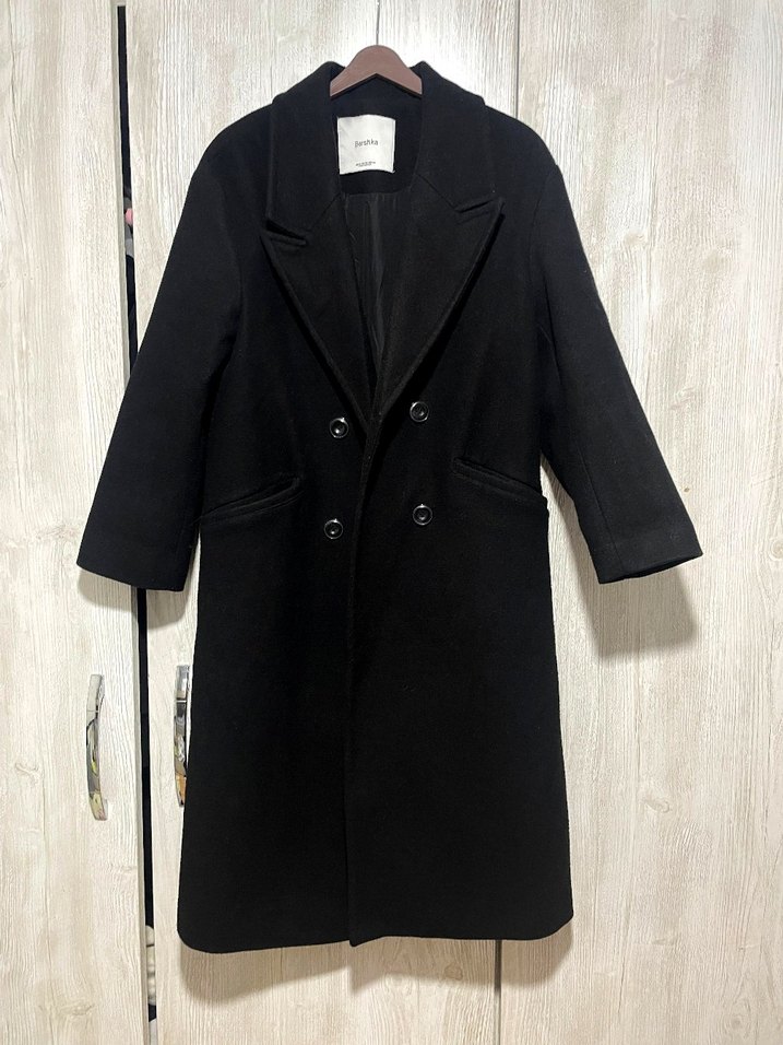 BERSHKA Siyah Çift Düğmeli Uzun Kaban