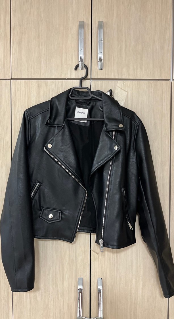 Siyah deri, fitted biker ceket; yakası çentikli, askılı kollu ve kemerli. Ürünün hiçbir sorunu yoktur giymediğim için satıyorum
