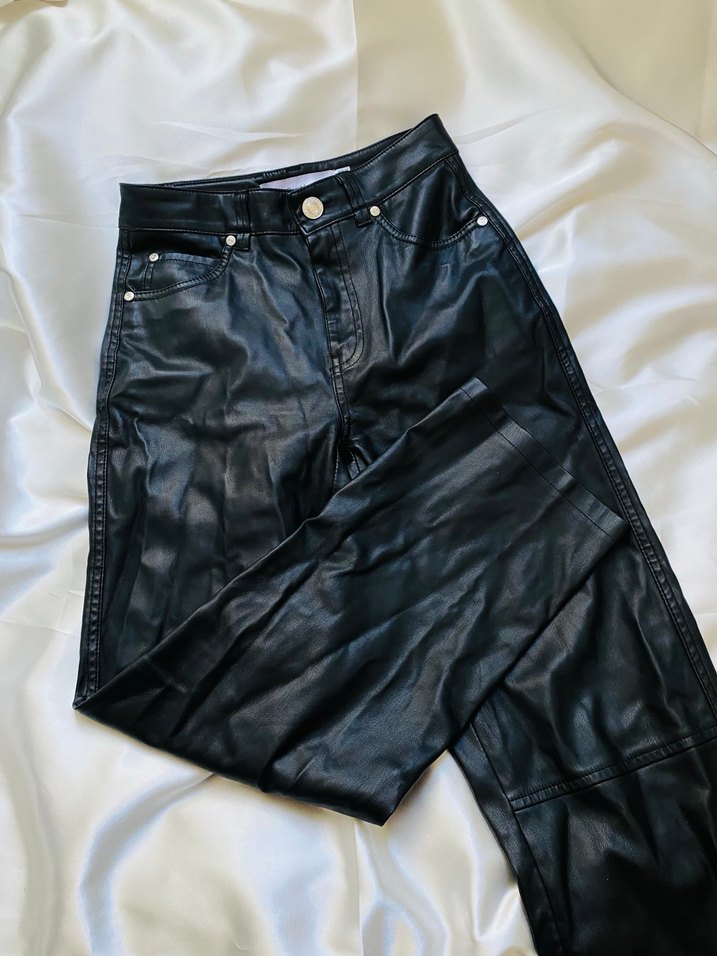 Düğmeli ve normal kesim siyah deri kadın pantolon. Midi boy, desen içermeyen yüzeye sahip, rahat günlük kullanım için uygundur.