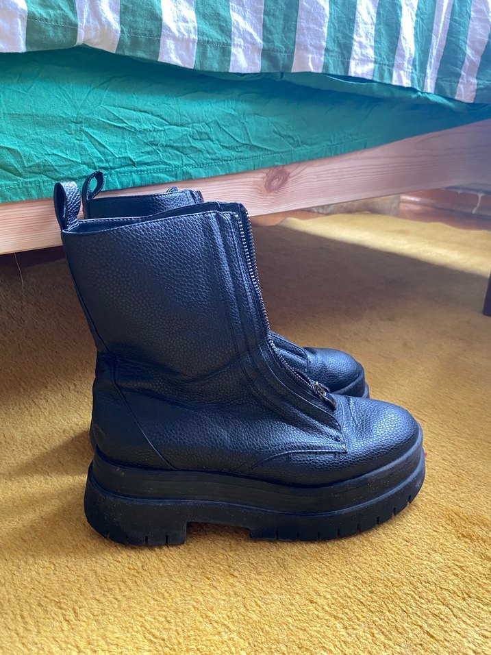 Siyah deri kadın botları, platform topuklu ve ön fermuarlı. Goth tarzında, gündelik kullanım için uygun, grunge punk havasında.