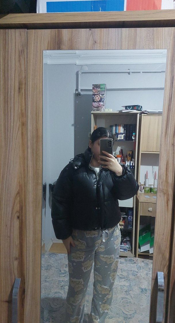 Siyah deri, şişme, bol kesim, yüksek yakalı ve uzun kollu kadın mont, günlük sokak stiline uygun. bikac kez giyildi