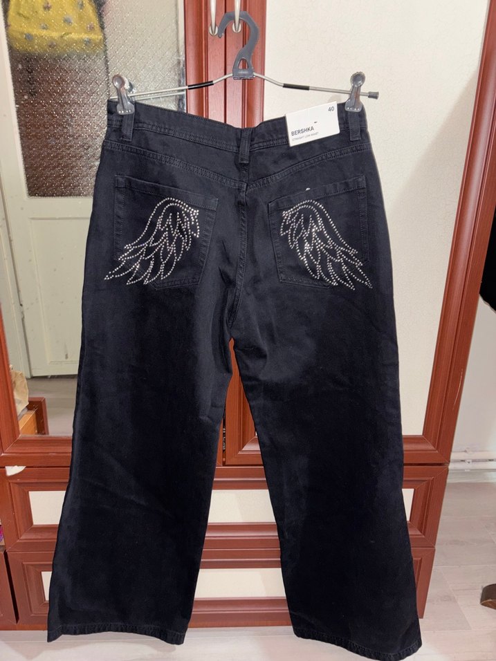 Bershka Siyah Işıltılı Kanat Baskılı Bol Kesim Jean