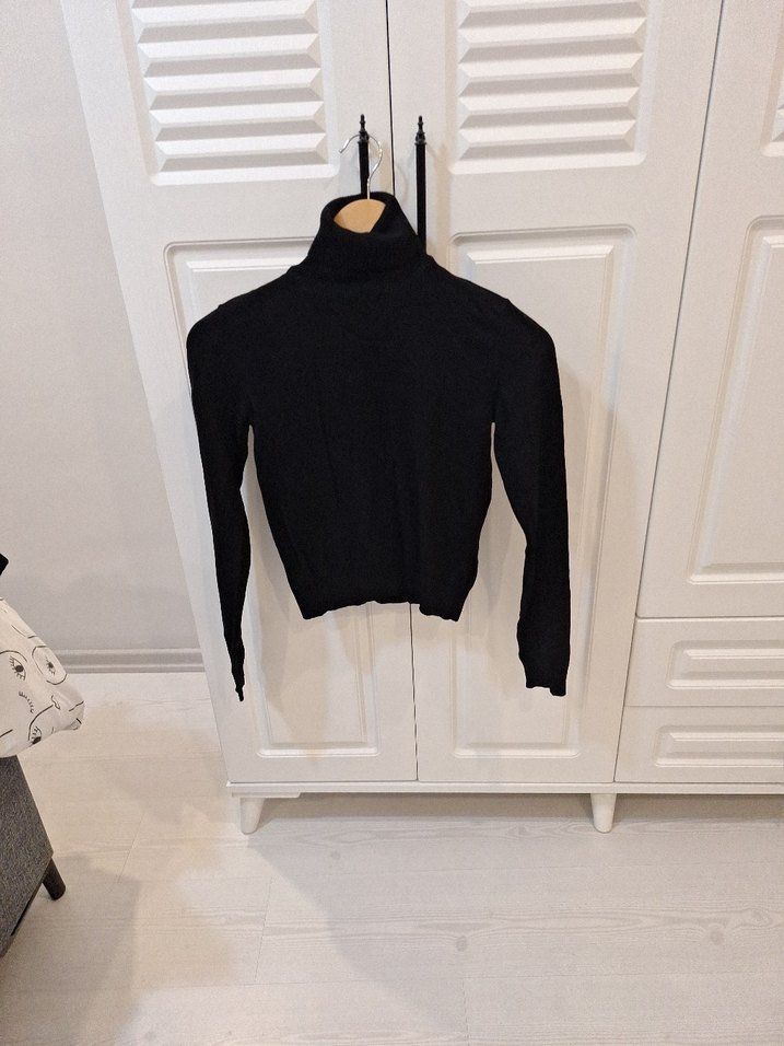 Siyah, boğazlı, uzun kollu, yün dokuma kadın triko kazak, normal midi boyda, minimalist ve desensiz tasarıma sahiptir. Günlük kullanıma uygundur. m beden ama kalibi dar