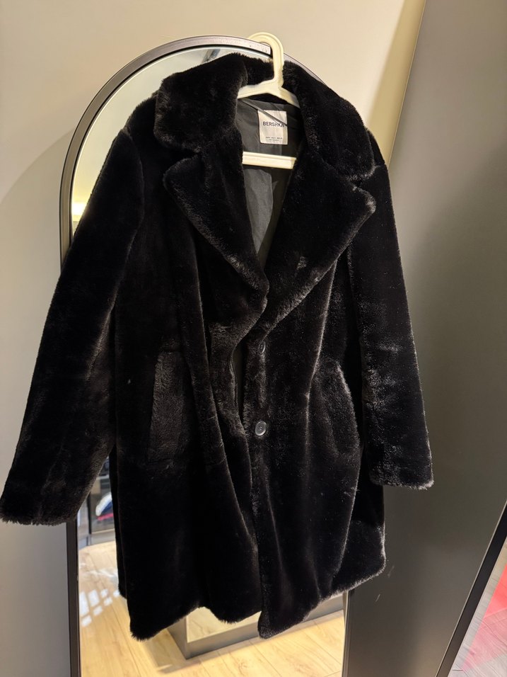 Siyah midi boy kadın kaban, yumuşak sahte kürk dokusu ve notlu yakası ile dikkat çekiyor. Uzun kollu, bol kesim bu parça, rahat ve şık bir sokak stili sunar.