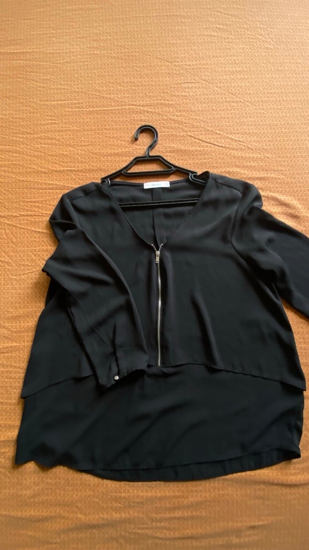 Siyah, uzun kollu, V yakalı ve önü fermuarlı bol kesim midi bluz. İpeksi kumaştan, günlük sokak stiline uygun. Tertemiz yepyeni