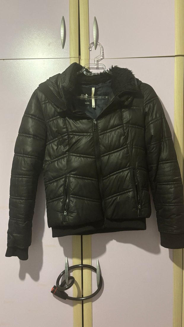 Siyah kürklü ve kapüşonlu normal boyda dar kesim kadın ceket. Sokak stili için uygun, günlük kullanıma ideal. #bershka