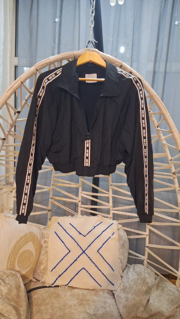 bershka siyah mini ceket, uzun kollu ve yüksek yakalıdır. Kollarda baskılı şeritler bulunur, bol kesimdir ve günlük sokak stili için uygundur. Tam mevsimi kaçırmayın