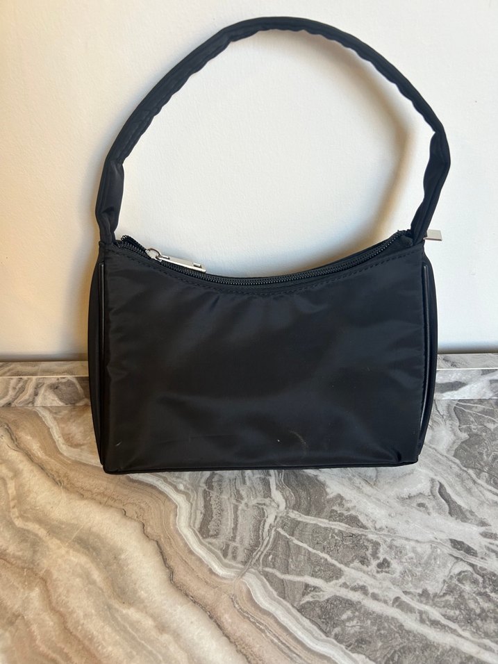 Siyah minimalist tasarımlı, fermuarlı ve sentetik kumaştan yapılmış kadın çantası. Günlük kullanım için uygundur.
