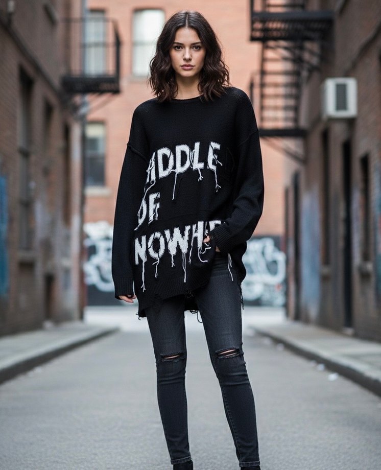 Siyah, oversize kesim, uzun kollu ve bisiklet yakalı triko kazak. Koyu tonlarda batik desenli ve önünde "ADDLE OF NOWHERE" baskısı bulunur.