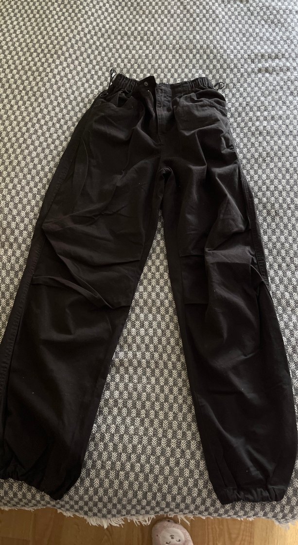 Siyah, kemerli, bol kesim kadın kumaş pantolon, midi boy, rahat sentetik kumaştan, dış mekan rahat kullanıma uygun. Herhangi bir kusuru yok